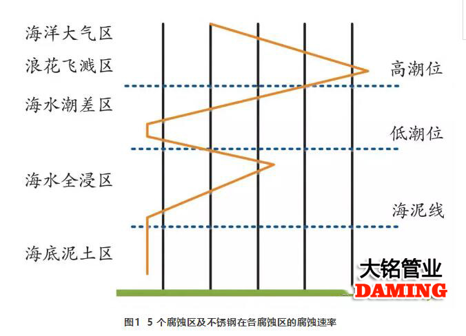 316L不銹鋼水管的耐腐蝕性能主要依靠鈍化膜的隔離作用。316L不銹鋼水管表面的鈍化膜由兩部分組成,內(nèi)層以鉻的氧化物為主,對(duì)腐蝕性離子有較強(qiáng)的阻擋作用,而外層以鐵的氧化物和氫氧化物為主。鈍化膜的形成能力和保護(hù)性能決定316L不銹鋼水管的耐腐蝕性。海水中Cl-及SO2-4濃度非常高,Cl-對(duì)鈍化膜有腐蝕作用,所以海水中Cl-濃度越大,鈍化膜腐蝕溶解速率就越大,鈍化膜的穩(wěn)定性能越差,316L不銹鋼水管材料表面形成的鈍化膜變得更疏松,均勻性更差,鈍化膜被破壞,因此316L不銹鋼水管被海水侵蝕。王志強(qiáng)等研究發(fā)現(xiàn),海洋環(huán)境根據(jù)其性質(zhì)的不同可分為5個(gè)腐蝕區(qū)域,分別為海底泥土區(qū)、海水全浸區(qū)、海水潮差區(qū)、浪花飛濺區(qū)以及海洋大氣區(qū)。5個(gè)腐蝕區(qū)及316L不銹鋼水管在腐蝕區(qū)的腐蝕速率如圖1所示。因每個(gè)區(qū)域的溫度、pH、溶解氧的情況不同,316L不銹鋼水管在不同區(qū)域有不同的腐蝕類型。在眾多腐蝕類型中,點(diǎn)蝕和縫隙腐蝕是主要的腐蝕類型。通過測(cè)量腐蝕電位,可以了解316L不銹鋼水管在海水中的抗腐蝕能力,而加入某些合金可以在一定程度上提高316L不銹鋼水管的耐蝕性。周建龍等認(rèn)為,在海水中影響316L不銹鋼水管腐蝕的因素中,海水中溶解氧的濃度是主要因素。在深海中的碳鋼腐蝕多數(shù)為均勻腐蝕,而316L不銹鋼水管在深海中多數(shù)為縫隙腐蝕。對(duì)深海中金屬的防腐多采用犧牲陽(yáng)極的方法。